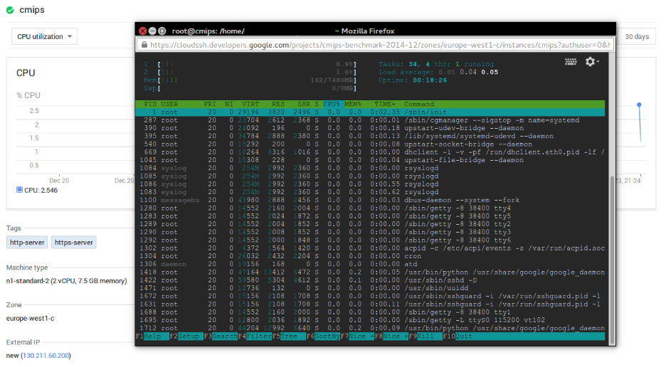 gcloud compute --project "cmips-benchmark-2014-12" instances create "cmips" --zone "europe-west1-c" --machine-type "n1-standard-1" --network "default" --address 130.211.60.200 --maintenance-policy "MIGRATE" --scopes "https://www.googleapis.com/auth/devstorage.read_only" --tags "http-server" "https-server" --image "https://www.googleapis.com/compute/v1/projects/ubuntu-os-cloud/global/images/ubuntu-1410-utopic-v20141217" --boot-disk-type "pd-standard" --boot-disk-device-name "cmips"